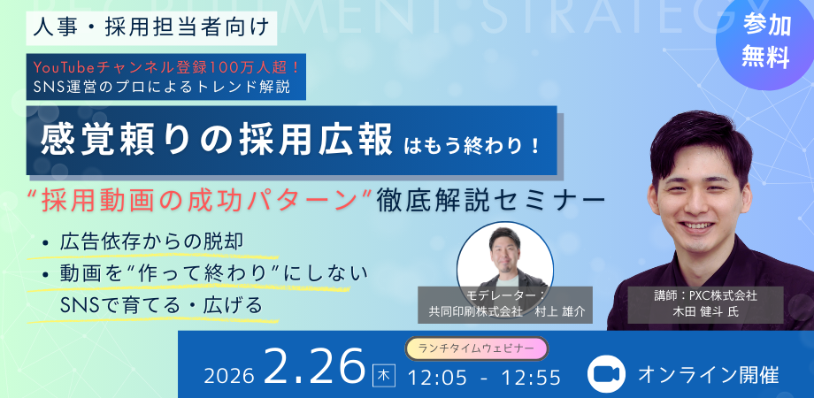 【セミナー開催】2026年2月26日(火)12時5分~『感覚頼りの採用広報はもう終わり “採用動画の成功パターン”徹底解説セミナー』